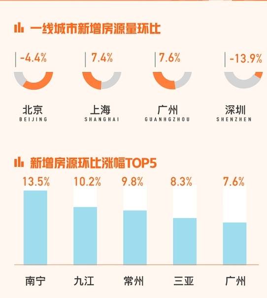 报告显示全国新增挂牌房源量环比下跌4.8%。一线城市北京和深圳出现一定程度的环比下跌情况,其中深圳新增挂牌房源量环比下降最为明显,为-13.9%;上海和广州新增挂牌房源量环比上涨均超过7%。从全国范围来看,南宁、九江、常州、三亚和广东环比上涨形势备受瞩目,其中南宁以13.5%的环比涨幅排名最高。