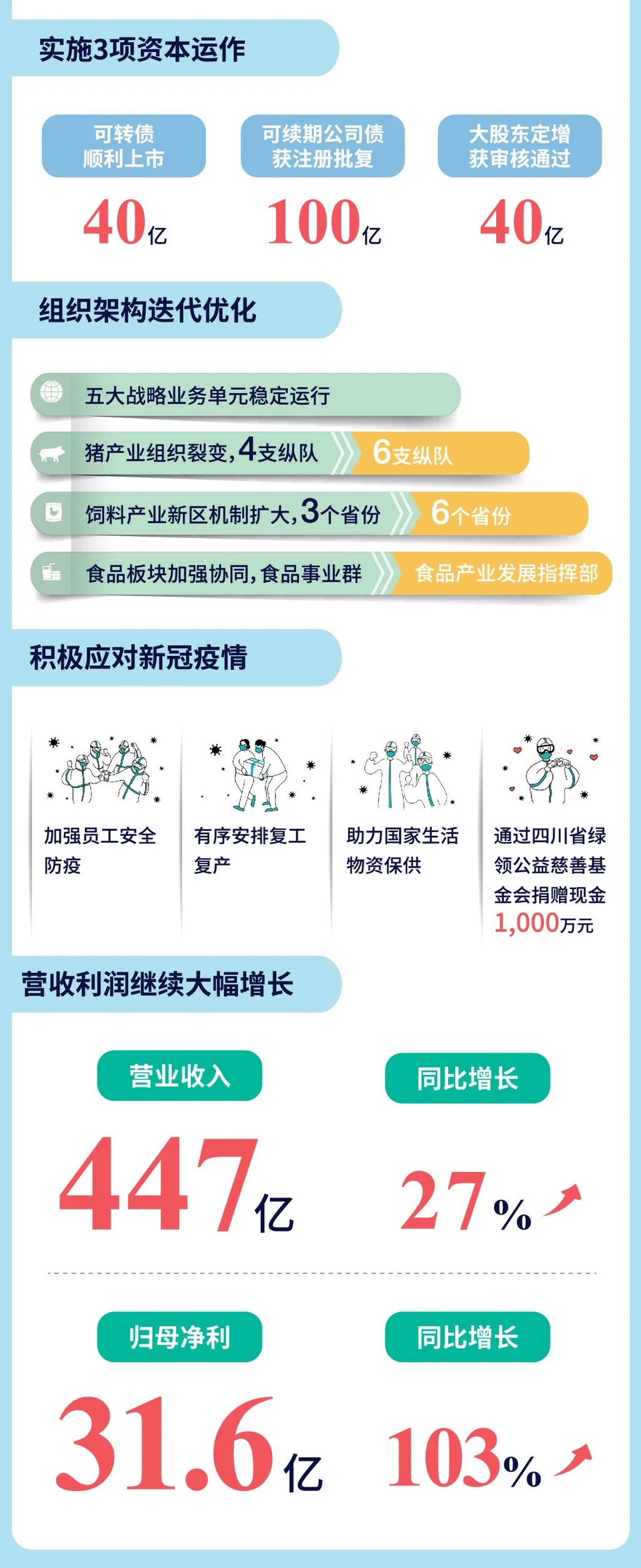 8月30日晚间,新希望(000876.SZ)发布2020半年报显示,公司上半年实现营业收入446.96亿元,同比增加94.02亿元,增幅为26.64%;实现归属于上市公司股东的净利润31.64亿元,同比增长16.02亿元,增幅为102.57%。
