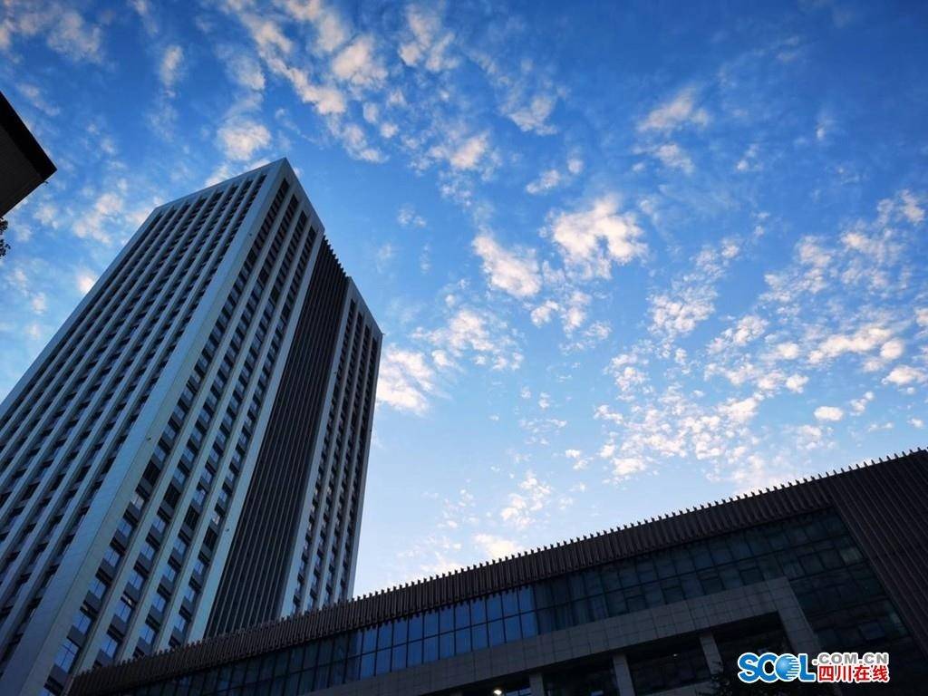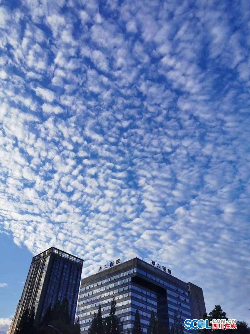 今天傍晚,成都天空上出现大片大片的鱼鳞云,夕阳映衬白云,天空像泛起金色的涟漪。