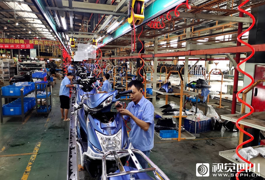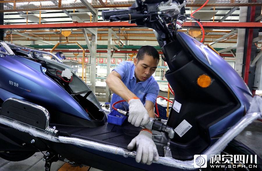 天府新区眉山片区视高街道的一电动车组装车间流水线上,工人们正在岗位上忙碌。