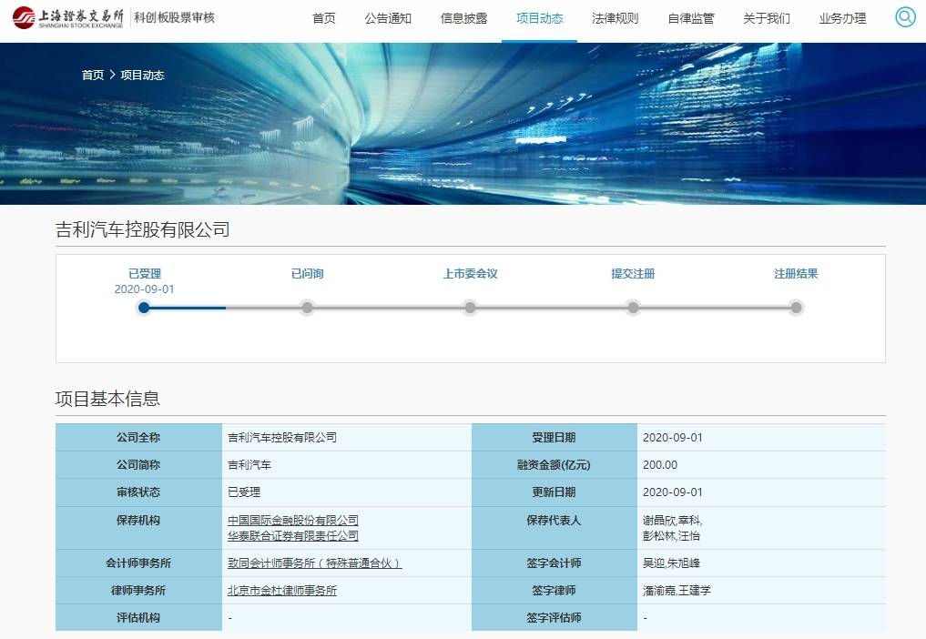 9月1日,上交所科创板股票审核官网信息显示,吉利汽车控股集团(简称“吉利汽车”)科创板IPO审核状态变更为“已受理”。据项目基本信息显示,吉利汽车拟融资金额为200亿元,保荐机构为中国国际金融股份有限公司、华泰联合证券有限责任公司。