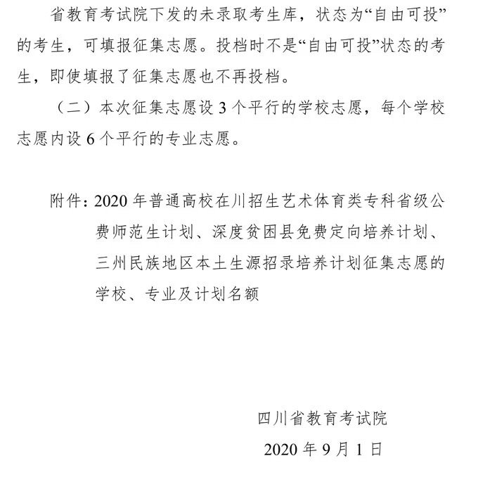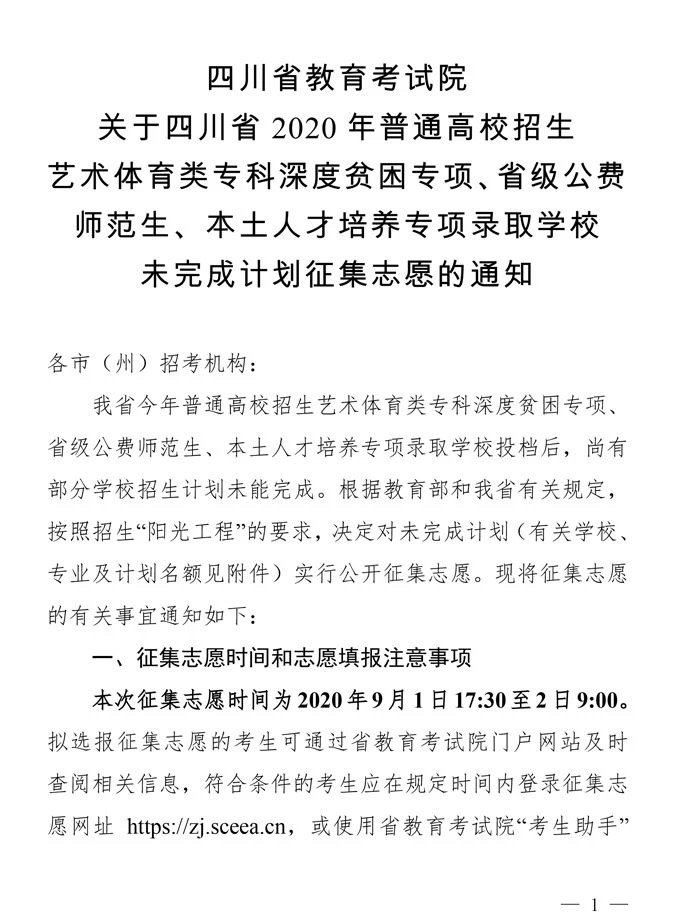 9月1日,省教育考试院发布消息,我省今年普通高校招生艺术体育类专科深度贫困专项、省级公费师范生、本土人才培养专项录取学校投档后,尚有部分学校招生计划未能完成,决定对未完成计划试行公开征集志愿,征集时间为9月1日17:30-2日9:00。