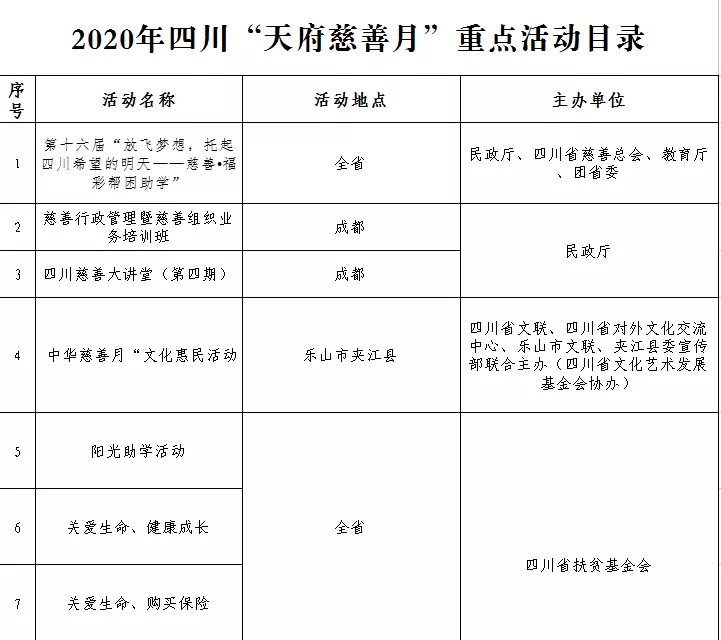 今年9月5日是我国第五个“中华慈善日”。9月1日,我省第二个“天府慈善月”活动正式启动,活动主题是“决战脱贫攻坚,助力疫情防控,参与基层治理”。