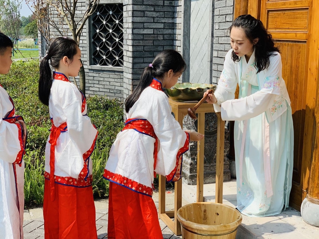 9月1日,开学第一天,泸州天立春雨学校内,20名春雨学校小学部学生身着中华传统服饰,老师吴君正在给学生行过“净手礼”踏入国学馆。张其摄