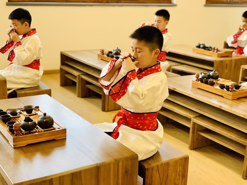 泸州天立春雨学校国学馆内,按国学、国艺、国术设立诵孝经、书法、古琴、围棋等10余项与中华传统文化相关的课程。开学第一天,学校组织学生参加国学体验课,让学生体验书法、茶艺、束修礼、佩香囊等课程,进一步了解中华传统文化,培养兴趣爱好。