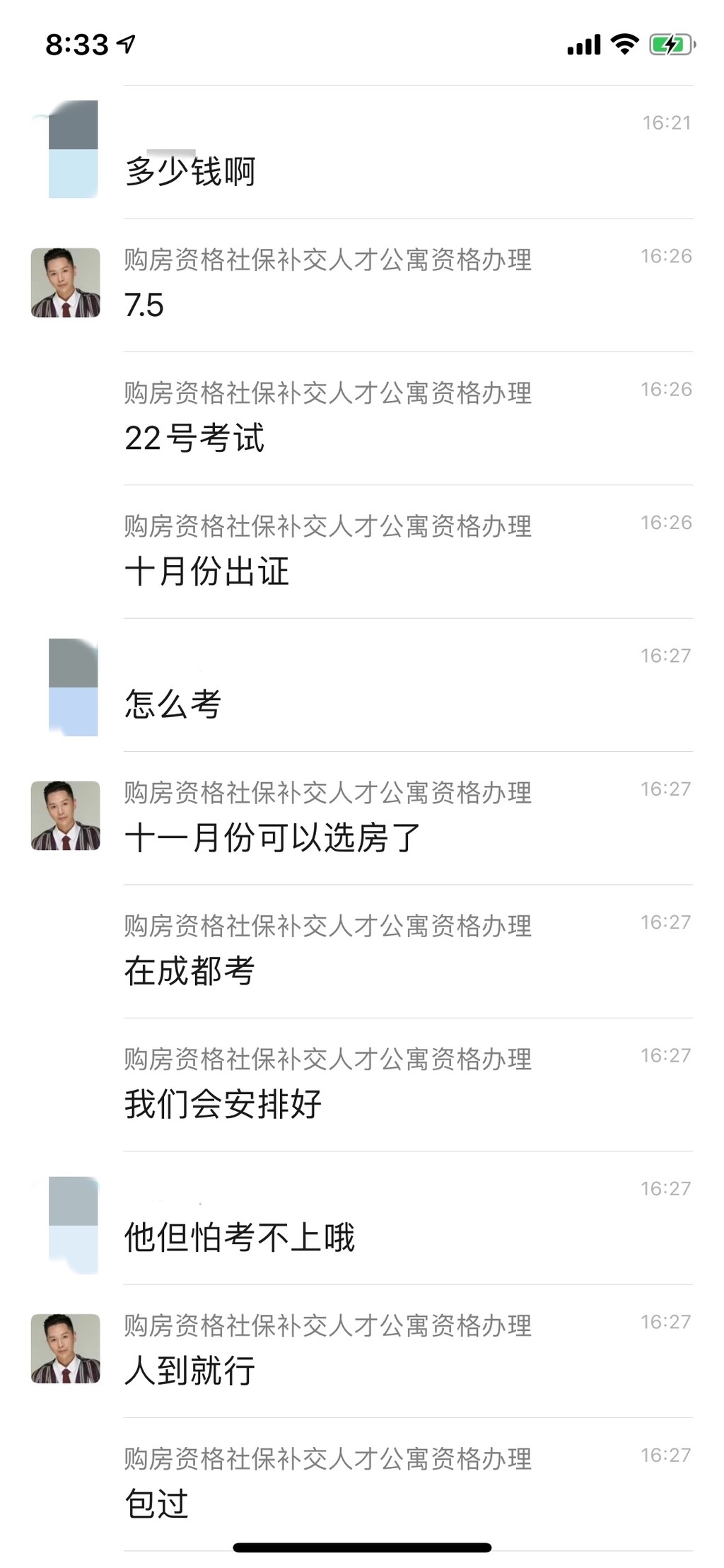 通过加入成都2个房地产相关的微信和QQ群组,记者发现,每个群里都有不少"代办人才公寓资格"的信息,有的网名直接就叫"人才公寓资格办理"。一名从事房地产工作的人士告诉记者:这样的信息从去年底今年初开始出现,最近越来越多。