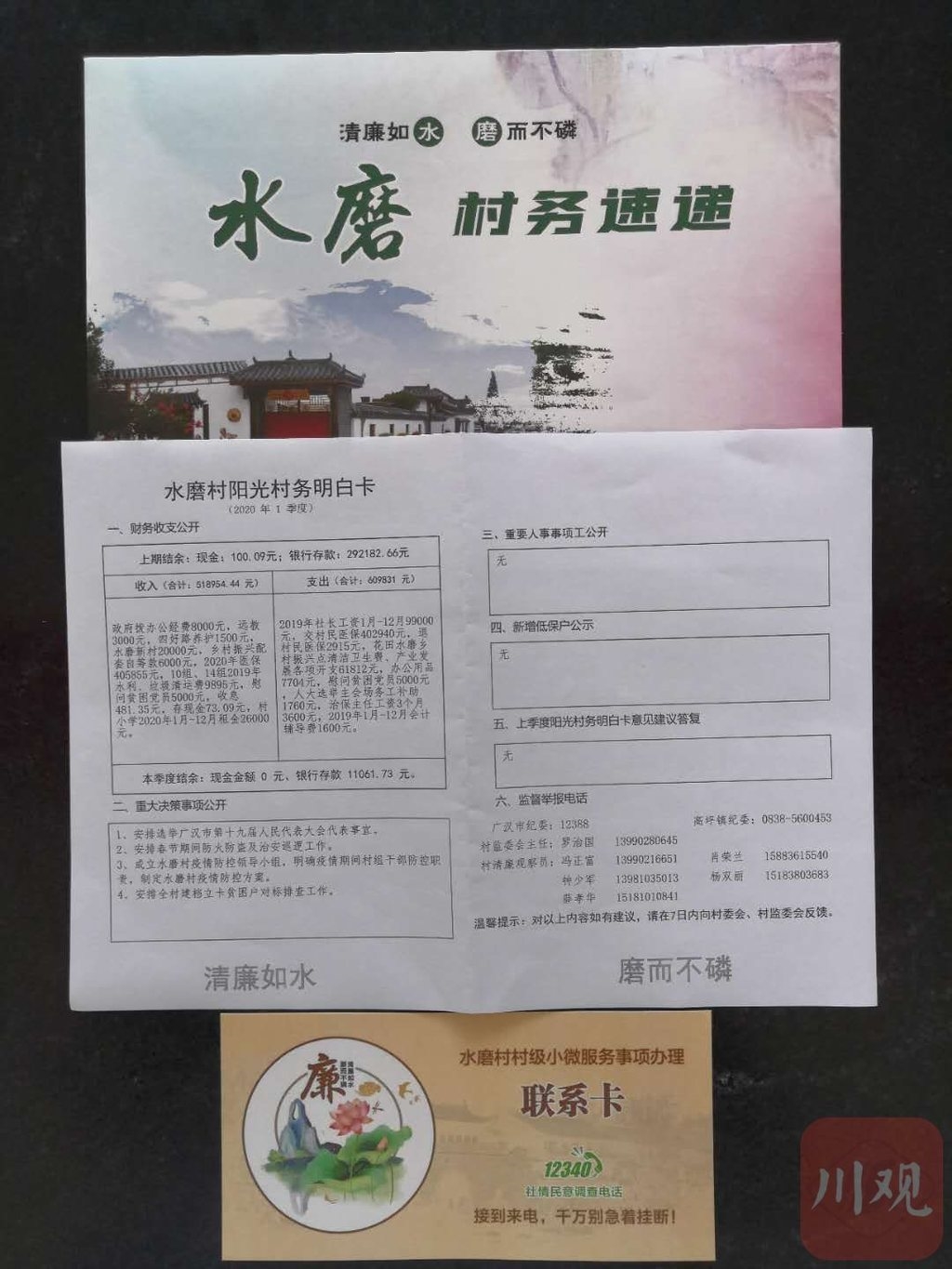 据了解,水磨村党务、村务、财务每季度都会在村级活动阵地公开栏“晒账”;同时,装有阳光村务明白卡、村级小微服务事项事项办理联系卡的村务速递,也将按照“一季度一配送”原则送至村民家中。