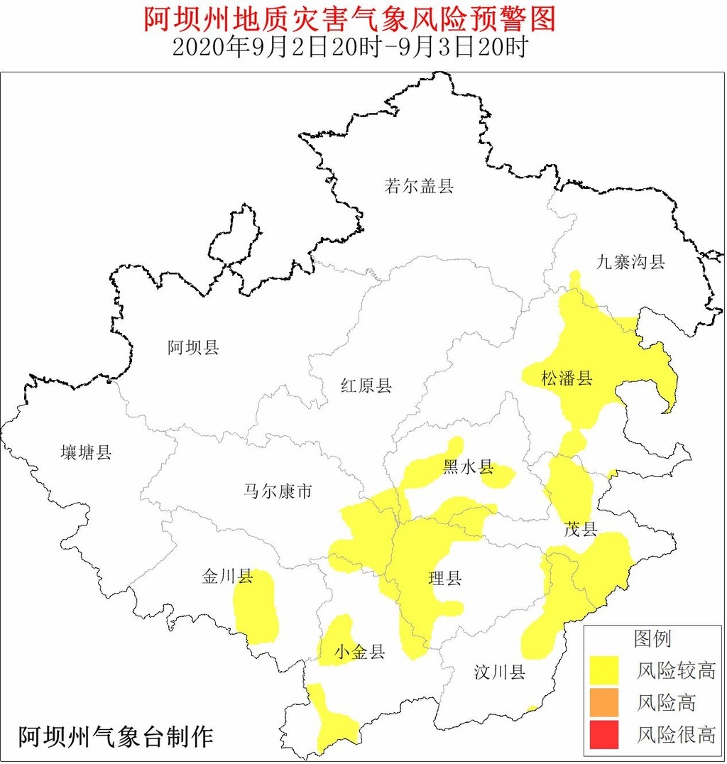 根据气象资料分析,9月2日20时-9月3日20时,汶川县、理县、茂县、松潘县、九寨沟县、金川县、小金县、黑水县、红原县、马尔康市等10县(市)发生地质灾害气象风险等级较高。
