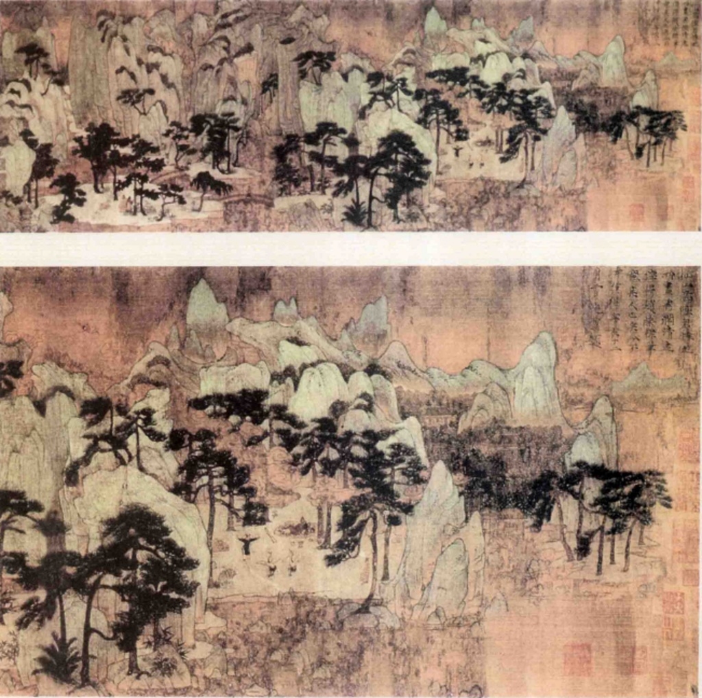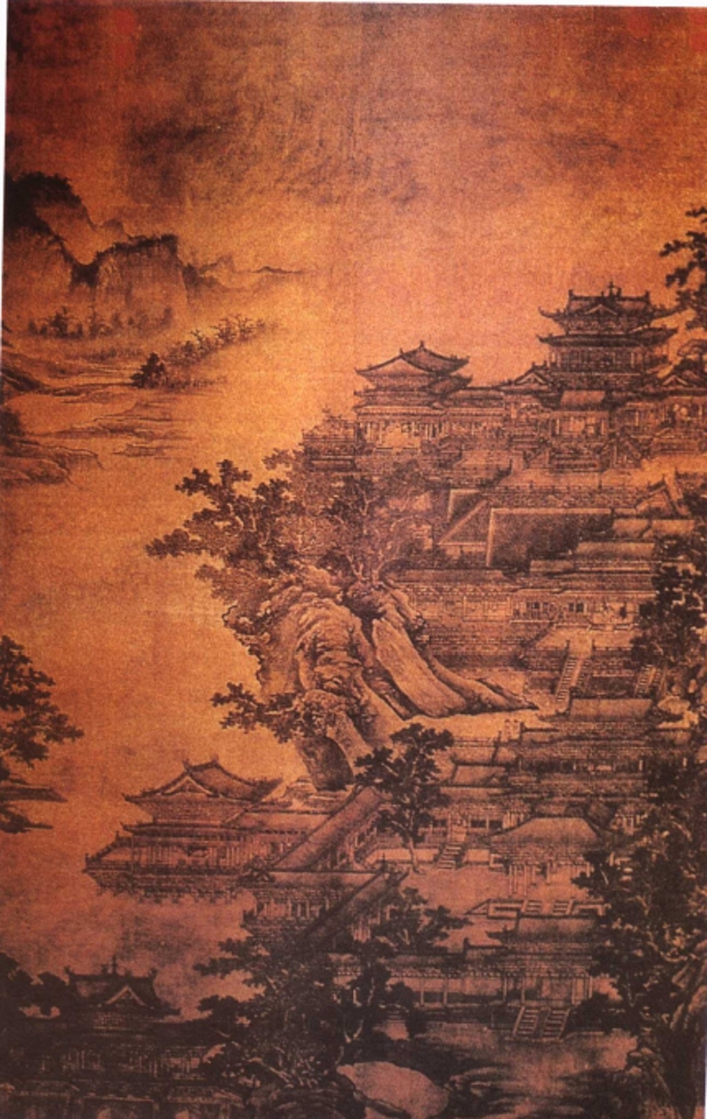 比如,元代时期的蜀人画家李容瑾,其所作界画楼阁,别具一格。元载入画史的界画家仅有三位,李容瑾就是其中一位。他师承王振鹏,但其山树画法比王振鹏略粗壮,楼台亭阁折算精确,界划工整。他的传世作品《汉苑图轴》现藏台北故宫博物院,使用统一的鸟瞰透视画法,描绘规模宏大的汉代宫苑,堂房回廊、楼阁台榭、曲径庭院、山石树木,天空远山,一派盛况。