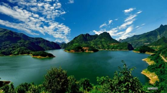 蓝天白云下的白龙湖