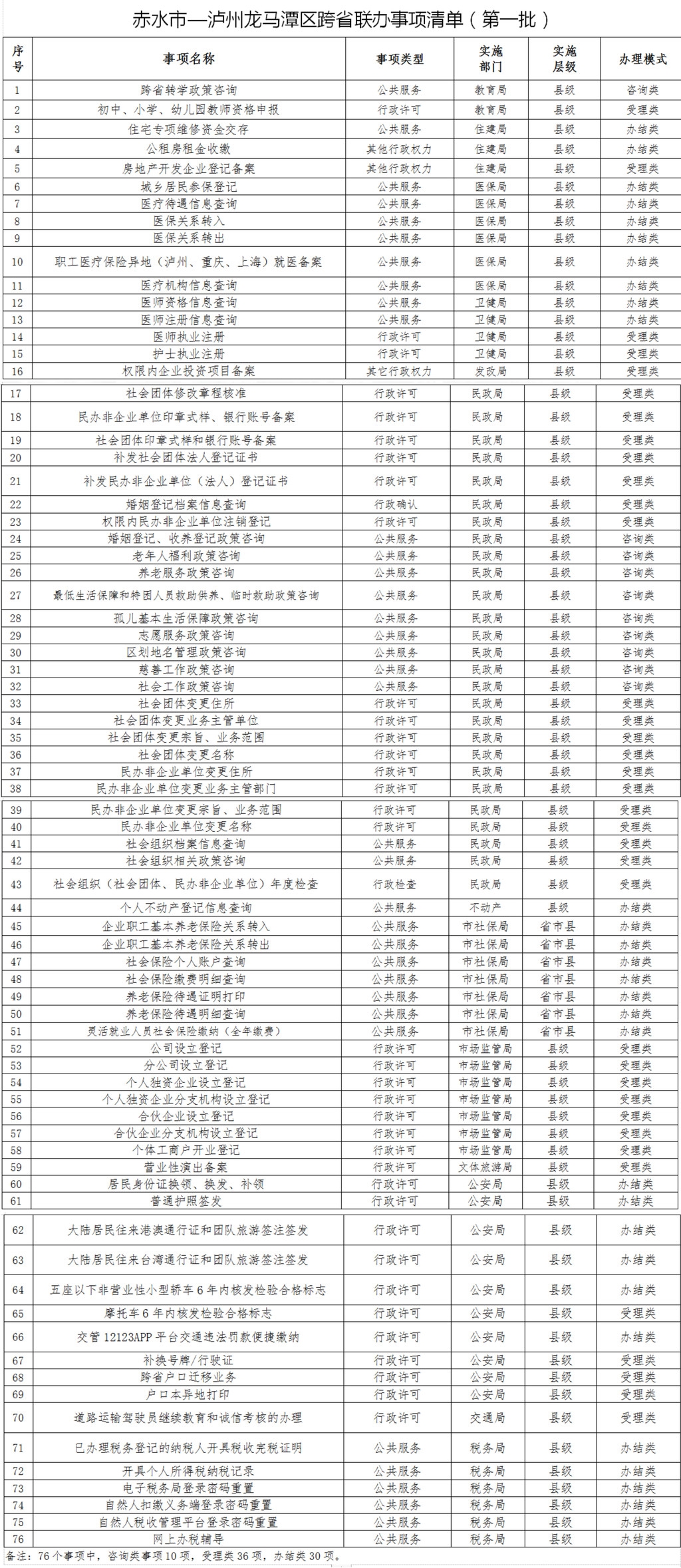 赤水市公安局相关负责人在接受赤水融媒体中心采访时表示,泸赤两地“跨省联办”工作启动,标志着两地公安机关警务合作进入新模式,目前梳理出的户口本异地打印、五座以下非营业性小型轿车、摩托车6年内核发检验合格标志等10个事项,均可在两地政务大厅实现异地办理。“如泸州市龙马潭区居民要将户籍迁移至赤水市,按以往流程,需要按照相关要求将申请材料拿到赤水市政务服务中心公安窗口,由当地窗口受理后出具准迁证,群众带上准迁证到泸州市龙马潭区政务服务中心公安窗口进行办理,并出具迁移证,最后群众再将迁移证带回赤水入户。实现“跨省联办”后,两地公安机关邮寄就可以了,群众不再来回多跑路。”