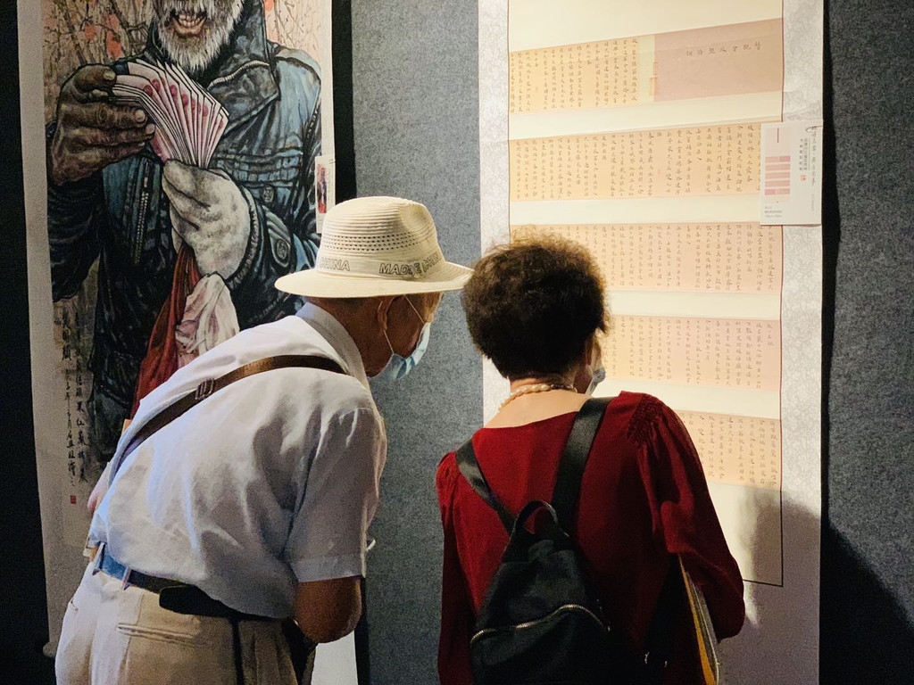 书法爱好者们正在观看展厅内的绘画作品。张其摄