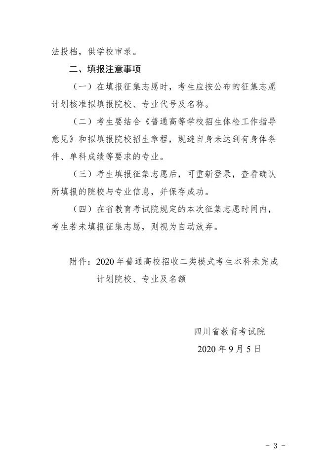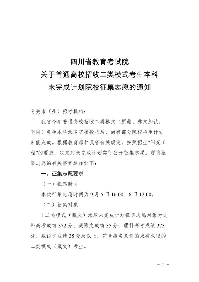 9月5日,记者从省教育考试院获悉,我省今年普通高校招生二类模式(原藏、彝文加试)考生本科录取院校投档后,尚有部分院校招生计划未能完成。根据教育部和我省有关规定,按照招生“阳光工程”的要求决定对未完成计划实行公开征集志愿,征集志愿时间为9月5日16:00至6日12:00。