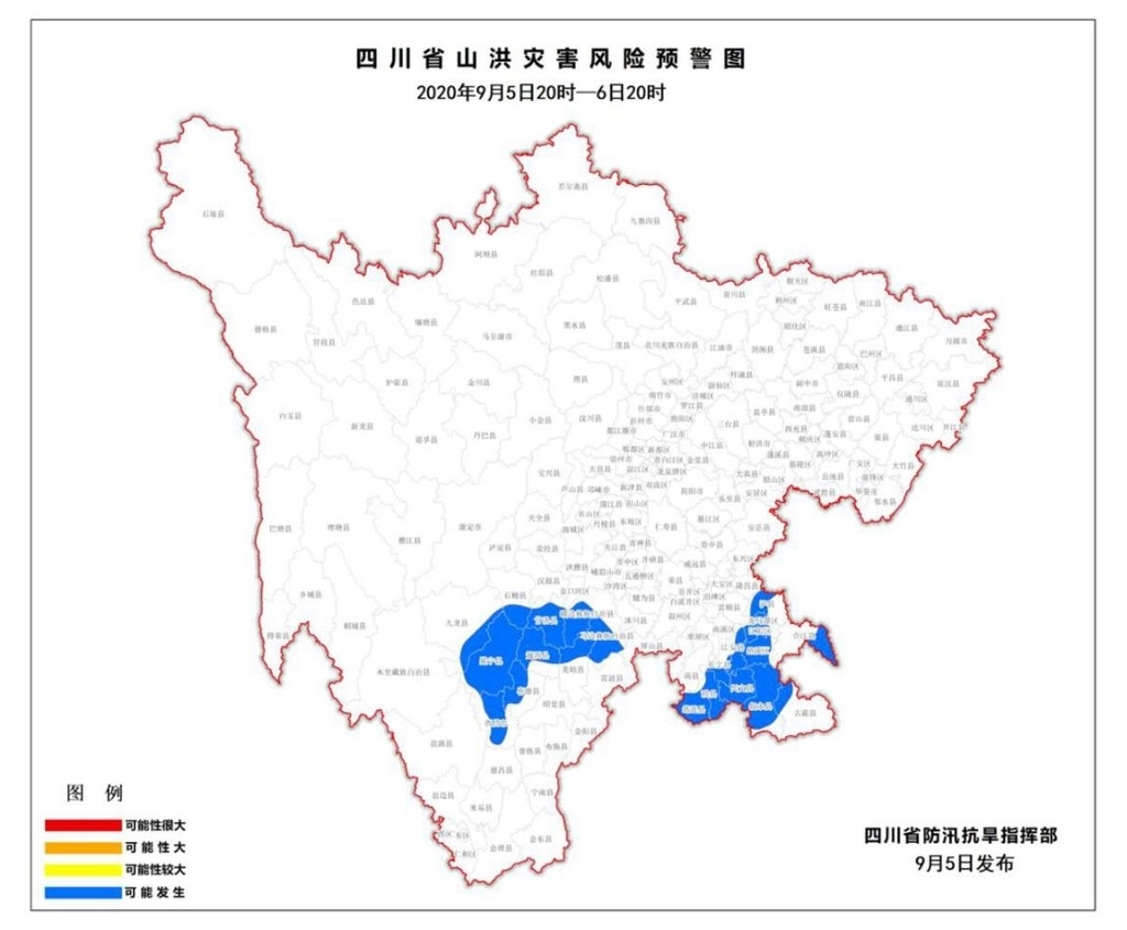 9月5日17时,四川省防汛抗旱指挥部发布山洪灾害蓝色预警。