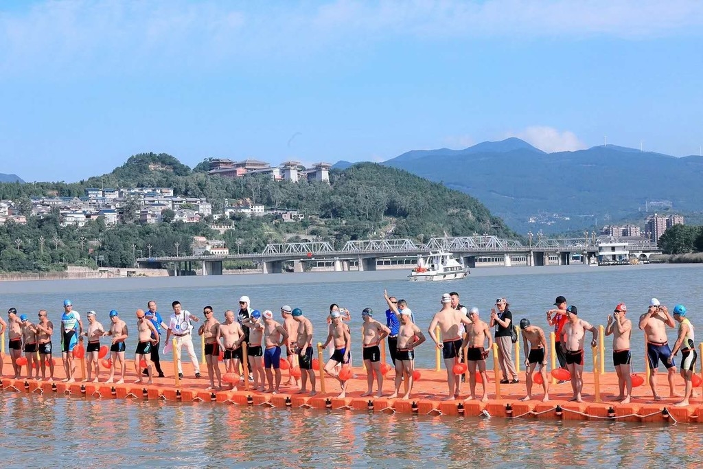 9月6日一大早,位于广元市嘉陵江畔的上海路码头博爱广场就热闹起来。一队又一对身穿泳衣背着游泳救生漂包游泳爱好者在码头上跃跃欲试,河岸上看热闹的群众围了里三层外三层。2020年“游遍四川”启动仪式暨“欢聚女儿节 畅游嘉陵江”游泳比赛开赛仪式正在这里进行。随着裁判员一声哨响,这些游泳爱好者按照此前分组,纷纷跃入水中,掀起层层水花,在碧波中你追我赶,场面甚是壮观。值得一提的是,考虑到这是四川省今年第一次在公开水域进行比赛,赛事主办方之一的四川省游泳协会从安全出发,将比赛起点设在了上海路码头博爱广场,终点则在对岸会展中心广场。“这一段嘉陵江江面宽约300米,平均水深超过5米,水流平缓,是适合举办比赛的。”四川省游泳协会主席李新双说,“而且,起止点斜线相连,竞渡线路直线距离约1000米。大部分参赛者都能够在20分钟左右的时间内完赛。”