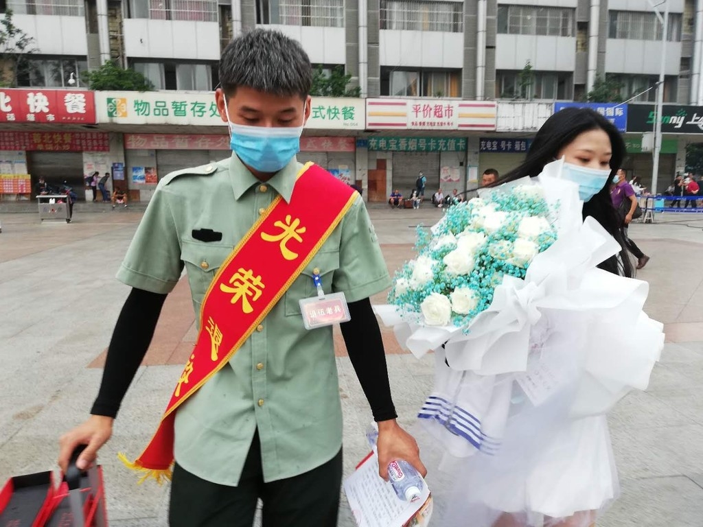 这位女孩名叫王静,是今年从新疆哈密某部退役返乡战士谌彪的女朋友。在谌彪当兵的这两年时间里,爱情的种子生根发芽、成长开花。“现在他退出现役,乘火车回家,我没有告诉他我会到车站来接他,就是要给他一个惊喜。”王静有些羞涩地说。