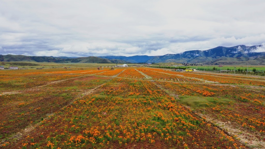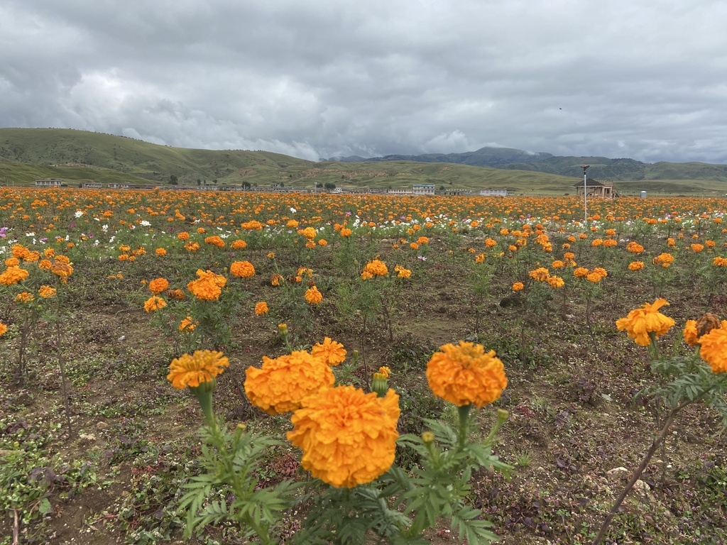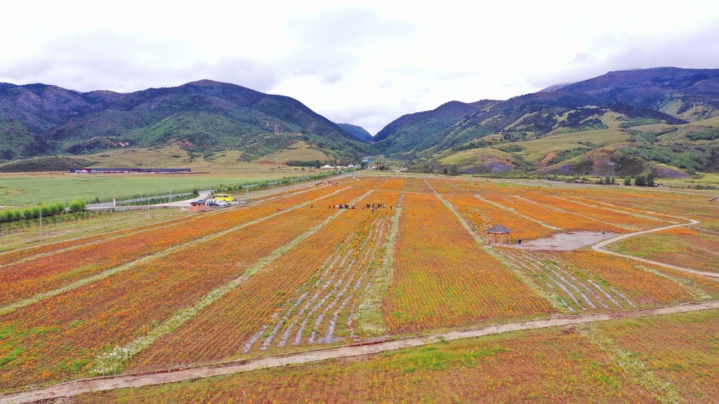9月6日,微风下的百亩金黄色万寿菊轻轻摇曳,与远处的青山交相辉映。记者来到位于甘孜州理塘县海拔3600米的濯桑乡汉戈村,800余亩波斯菊和万寿菊竞相绽放,大量游客纷纷置身花海中拍照留影。