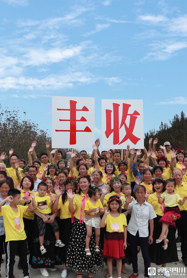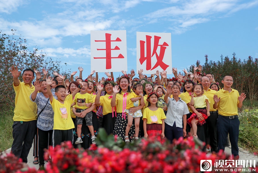 华蓥市禄市镇凉水井村村民, 与来自城区的居民一起展示刚采摘的药用紫薇花,迎接“丰收节”。