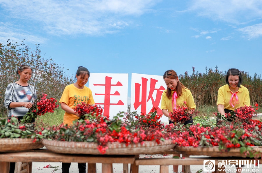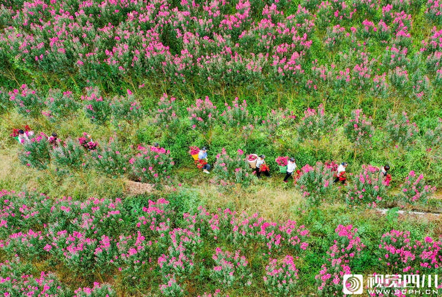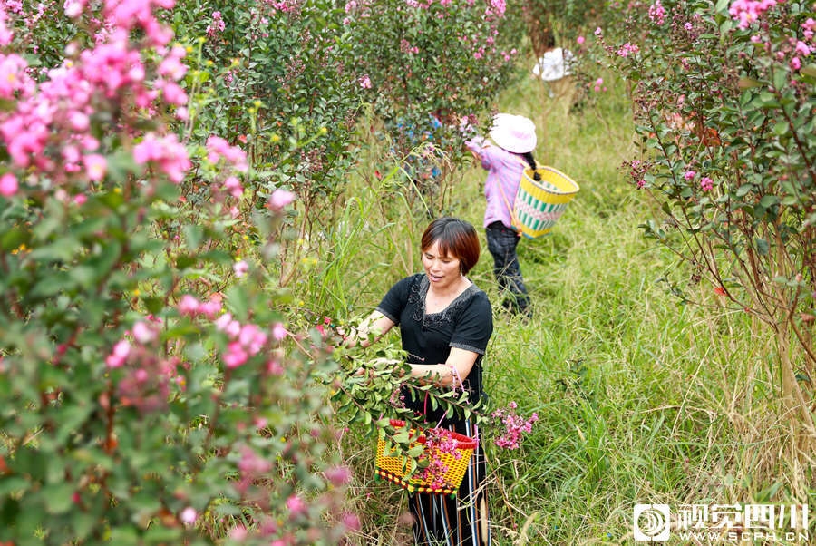 华蓥市禄市镇凉水井村村民, 与来自城区的居民一起采摘药用紫薇花,迎接“丰收节”。