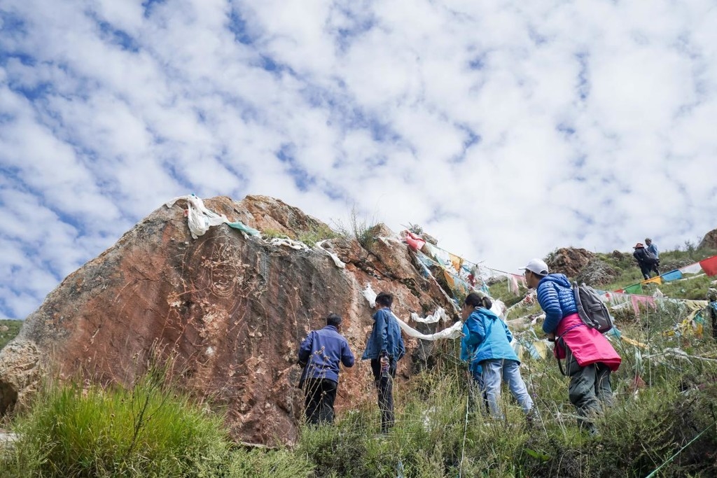 “丝路甘孜·康藏秘境”科考团连日来一直奔走在甘孜境内各地。近日,科考团抵达石渠,对石渠唐蕃古道上的摩崖石刻岩画群等进行考察。专家们认为,这些石刻岩画虽然刻在唐蕃古道上,且有的礼佛人像是吐蕃时期风格,但在一幅石刻造像旁,专家却发现了“杨二造佛也”的汉语题字。科考团藏学专家总结说“杨二”的汉文题记很重要,体现了多民族文化融合,所以融汇了不同民族的文化特点。