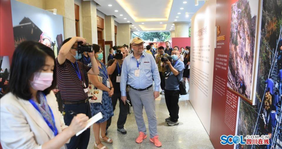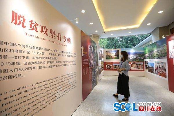 在发布会会场——成都西郊金牛坝的金牛宾馆俱乐部,一场《脱贫攻坚看今朝—四川决战决胜脱贫攻坚掠影》展览深深吸引了中外记者驻足了解。