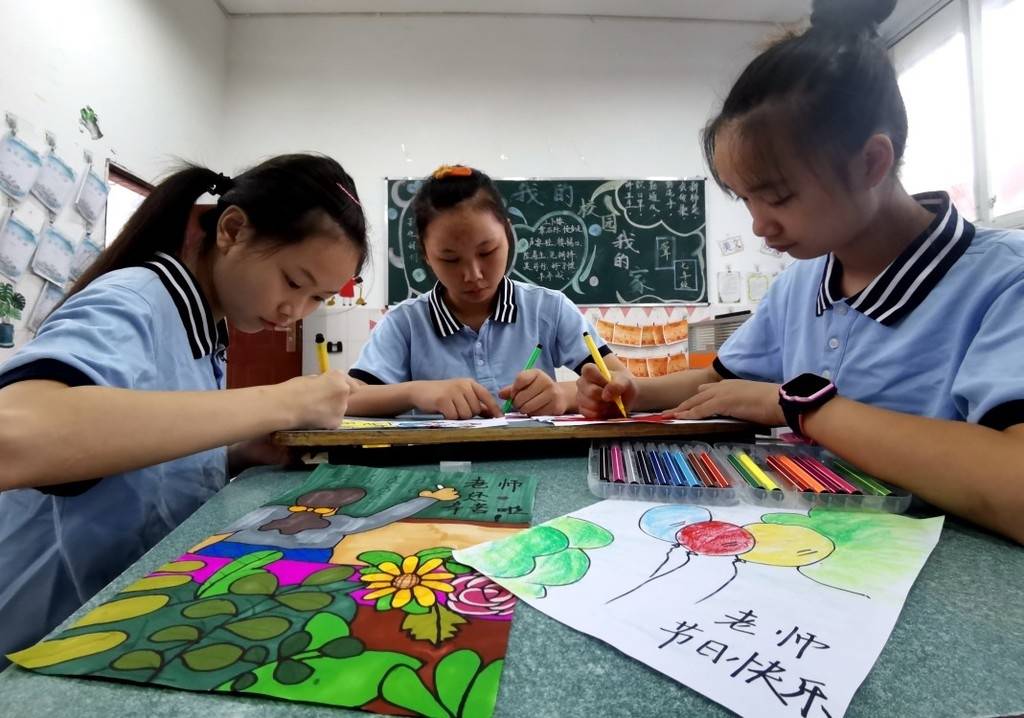 9月9日这天,记者在学校见到,每个班的孩子们又都在黑板上制作了简单朴素的海报,同时,有的班还自发排练手语舞蹈,制作彩色画和手工纸花来送给老师。