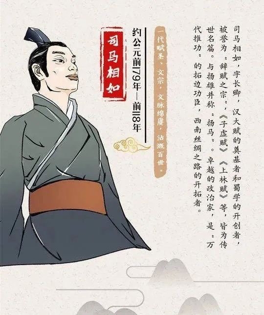 字长卿,汉景帝时为武骑常侍,因病免,客游于梁。梁孝王死后,相如归蜀,得临邛(今成都邛崃市)富商卓王孙之女卓文君。汉武帝读到其居梁时所作《子虚赋》,大为赞赏,因得召见,任为郎。曾拜中郎将奉使西南,后转任孝文园令,晚年免官闲居而卒。西汉时期,任文翁石室教师。
