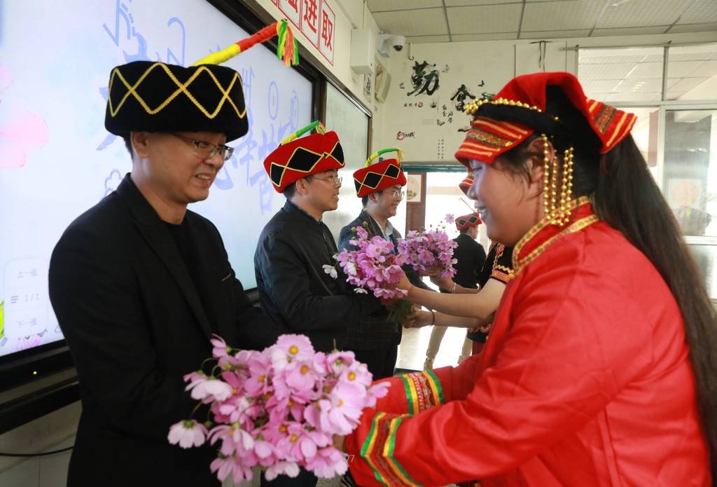 9月9日,在盐源民族中学“泸州班”高二文科班教师里,学生们为6名支教老师戴上他们的帽子。蒋凡 摄