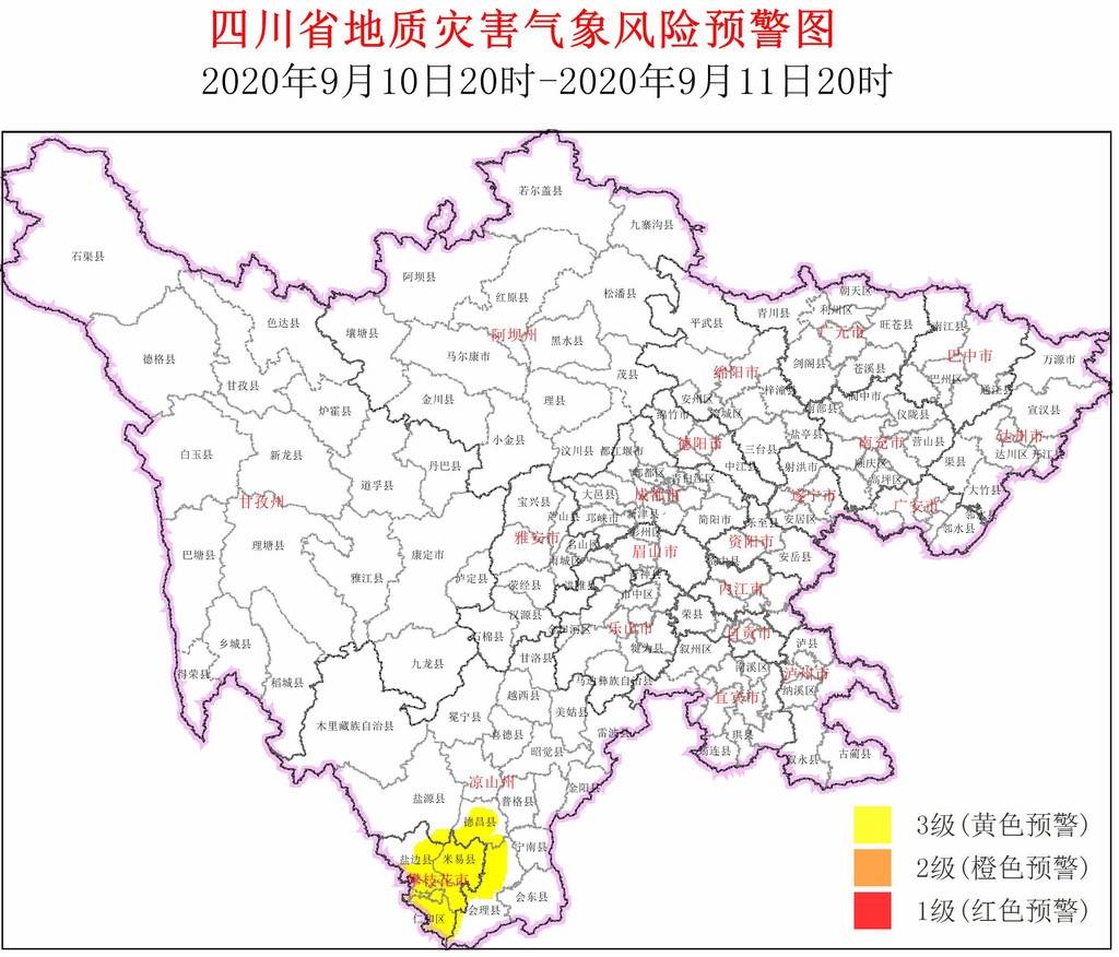 9月10日,四川省地质灾害指挥部办公室发布全省地质灾害气象风险预警。结合四川省气象台天气预报情况,9月10日20时~9月11日20时,全省地质灾害气象风险预警结果如下: