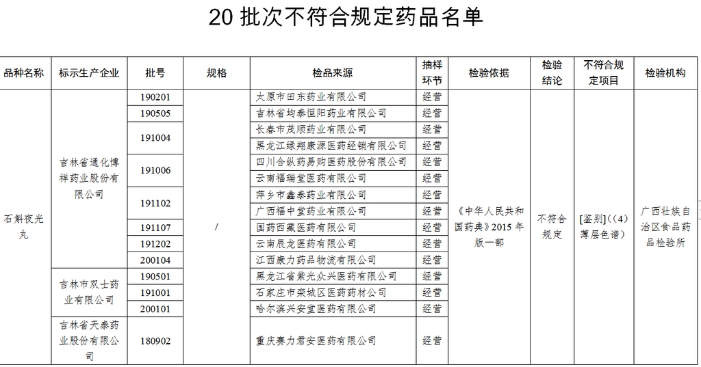9月10日,记者从省药监局获悉,近日国家药监局网站发布《国家药监局关于20批次药品不符合规定的通告(2020年第57号)》。通告称,经广西壮族自治区食品药品检验所等7家药品检验机构检验,标示为吉林省通化博祥药业股份有限公司等10家药品生产企业生产的20批次药品不符合规定。