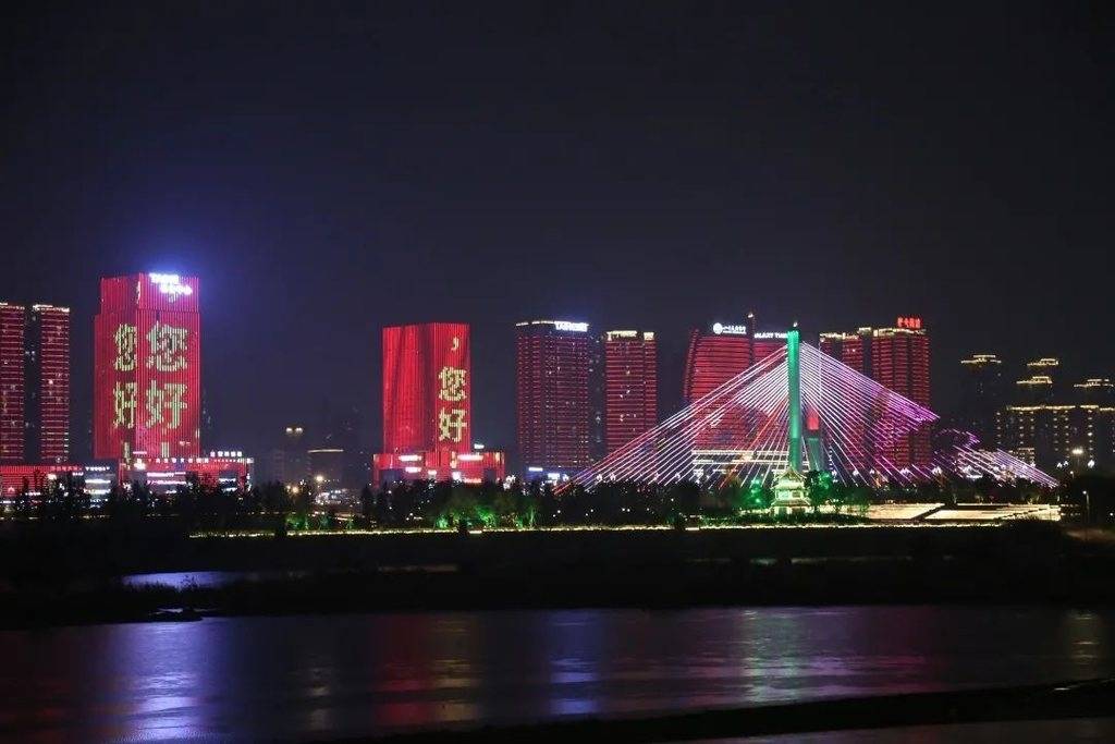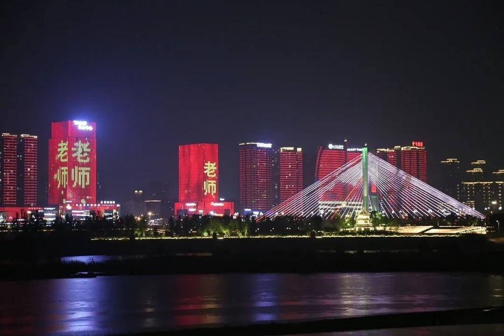 南充市顺庆区嘉陵江畔建筑的外立面电子屏上,“老师,您好!”“老师,您辛苦了!”等祝福语轮番播放。黎涛 摄