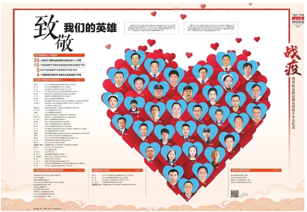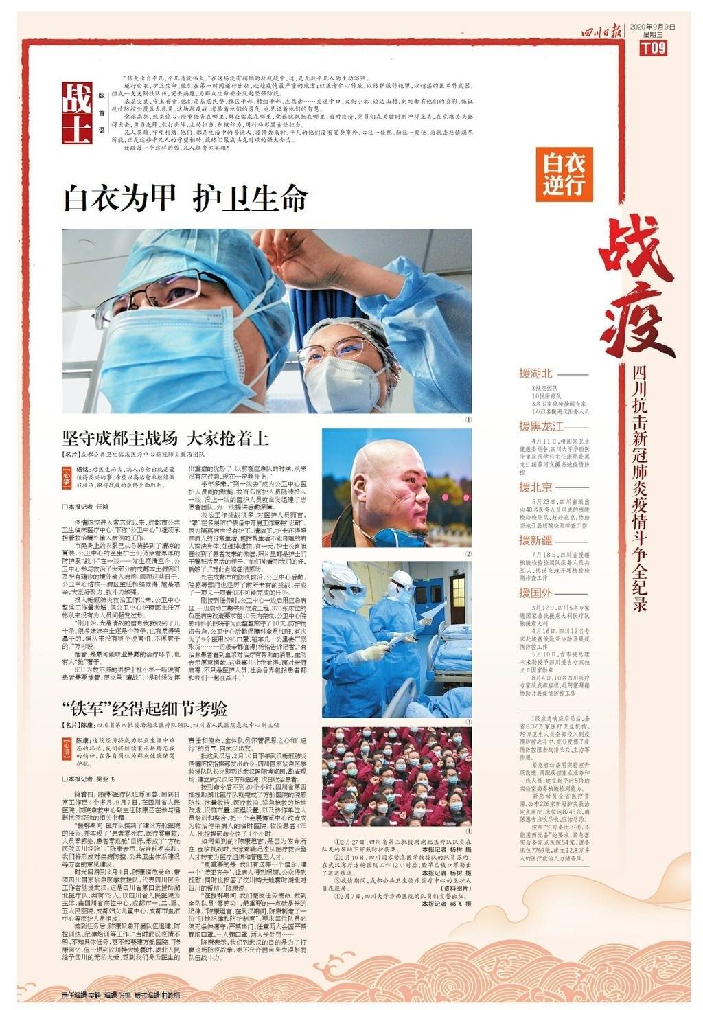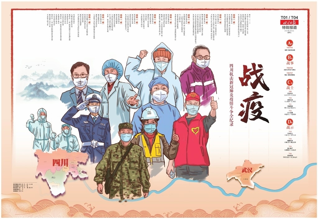 9月9日,四川日报推出16个版的“战疫——四川抗击新冠肺炎疫情斗争全纪录”特刊,全程回顾了自新冠肺炎疫情发生以来至今,我省经历的惊心动魄的抗疫大战和一场艰苦卓绝的历史大考,致敬这些抗疫一线的英雄们。