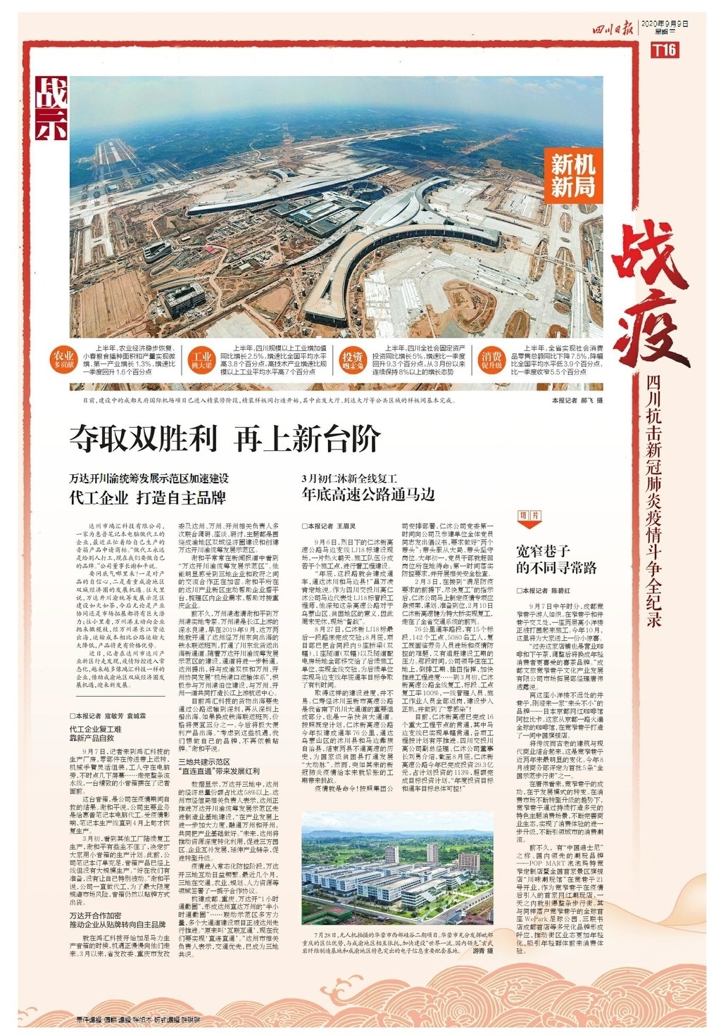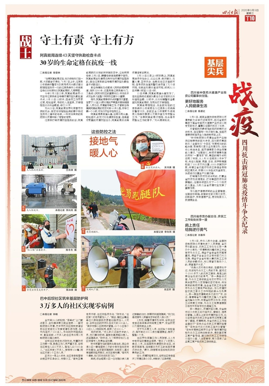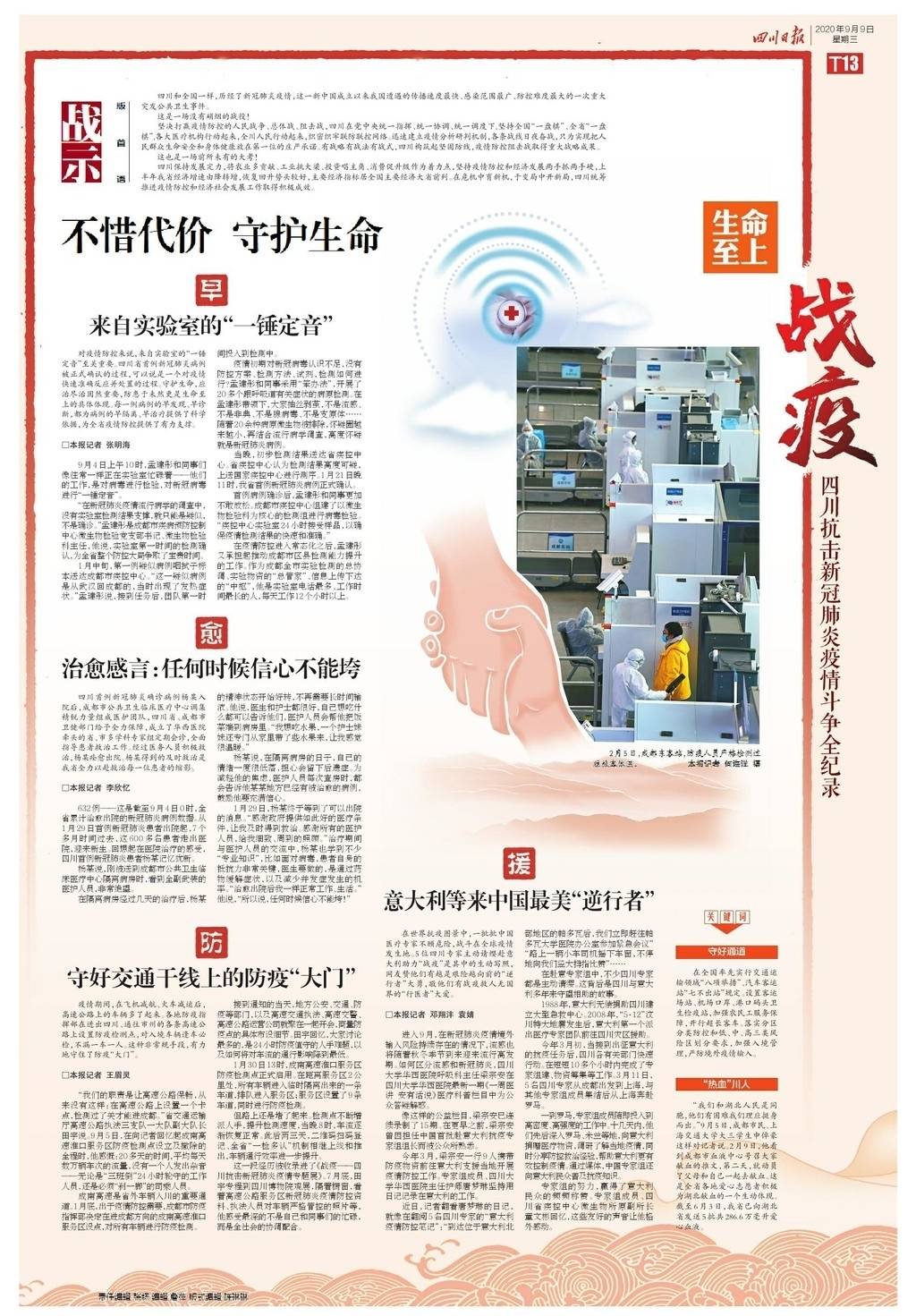 9月9日,四川日报推出16个版的“战疫——四川抗击新冠肺炎疫情斗争全纪录”特刊,全程回顾了自新冠肺炎疫情发生以来至今,我省经历的惊心动魄的抗疫大战和一场艰苦卓绝的历史大考,致敬这些抗疫一线的英雄们。
