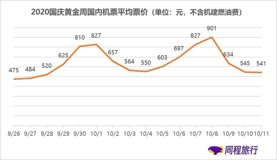 旺盛的出行需求推高了机票的平均票价。根据大数据预测,国内主要航线的机票价格将有明显上涨,9月30日和10月1日两天的机票价格为810元和827元,返程高峰的平均票价最高将达到901元,接近去年国庆黄金周的同期水平。(注:机票价格不含机建燃油费)