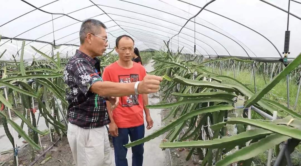 走在采摘园,看着已经挂出的色泽亮丽的火龙果,杨阿凯很是满足。“别小看它们,火龙果品种是在台湾多次夺得冠军的品种,试种一年就成功挂果给我增添了不少信心”。