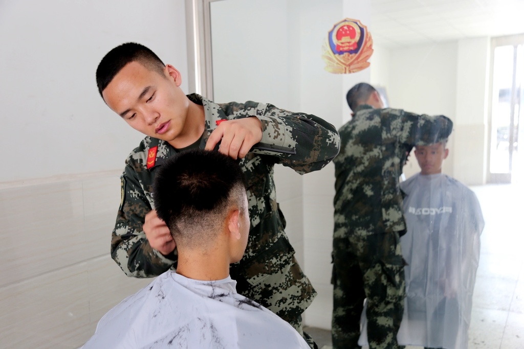 回到宿舍,新训干部骨干们拿着理发工具开始对新兵“下手”了。“班长,三毫米?不行,太短了,不会太难看吧?”“你要相信班长的手艺,我号称乐山托尼,理完绝对让你比以前更帅……”