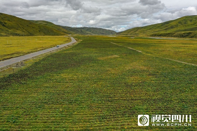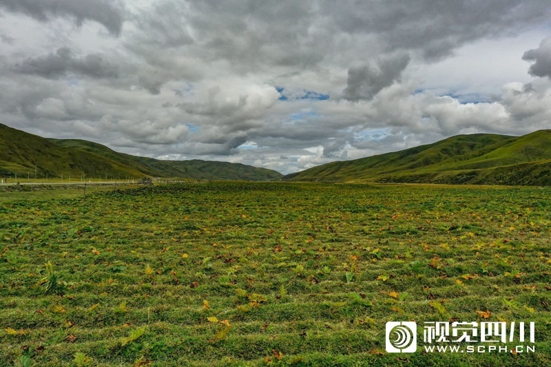 “苗子都长得不错,你看这些大多数都有5、6片大叶子,说明根已经扎进土里二三十公分了,今年过冬应该问题不大。”9月11日中午,色达县克果乡负责人罗君柯蹲在地边,察看着大黄的生长情况。从色达县城出发,大约两个小时车程,就来到了克果乡吉日过娃二村,省道454右侧成片成片种植着大黄。“路边拦着的这一大片之外,你看那边的河滩地种的也是大黄。”罗君柯告诉记者,2500亩大黄今年4月种植,即将迎来第一个冬天的挑战。