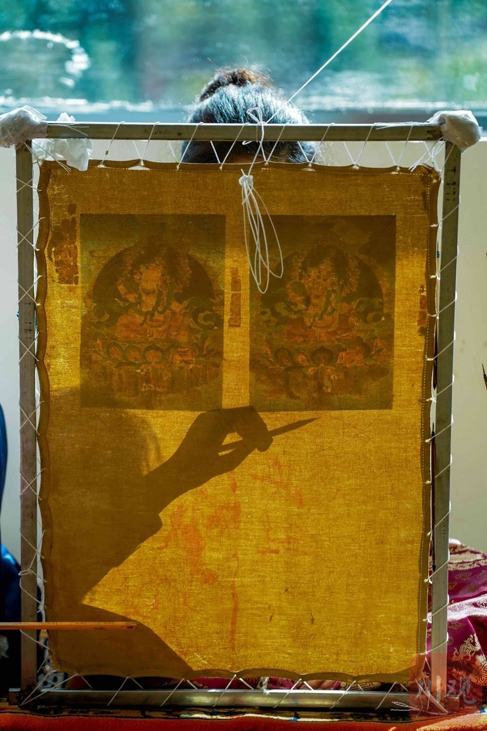 9月11日下午,我们来到阿坝州壤塘县中壤塘镇壤巴拉非遗传习创业园采访,走进唐卡画师更滚家里时,他正在专心致志在描唐卡。