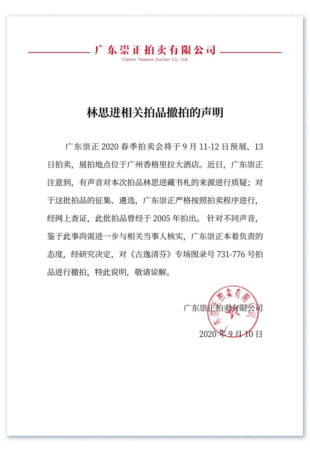 9月11日,记者从“广东崇正拍卖有限公司”微信公众号上看见,该公司已经于9月11日,发布“关于林思进相关拍品撤拍的声明”。声明中称“鉴于此事尚需进一步与相关当事人核实,广东崇正本着负责的态度,经研究决定,对《古逸清芬》专场图录号731-776号拍品进行撤拍,特此说明,敬请谅解。”