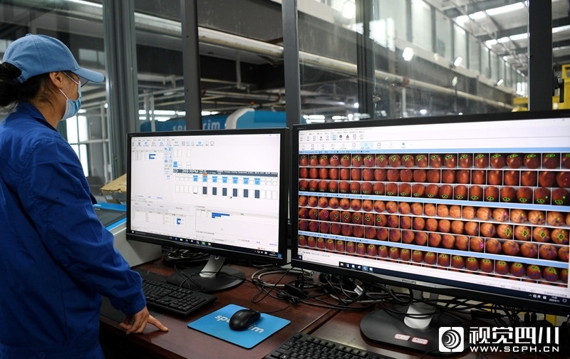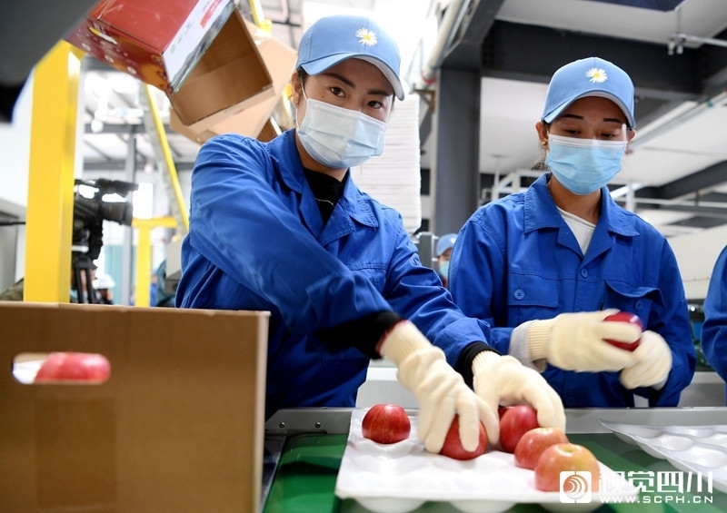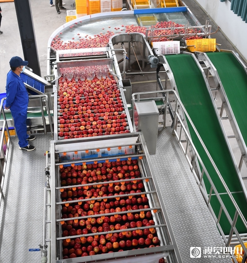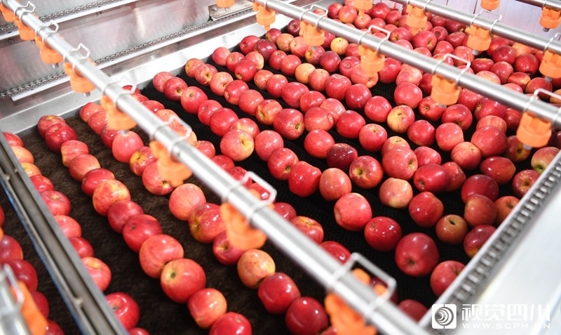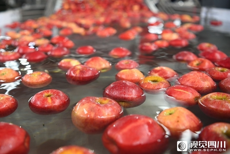 9月11日,凉山州越西县现代农业产业园大瑞苹果基地自动化生产线上,工人们正在对苹果进行清洗和包装。