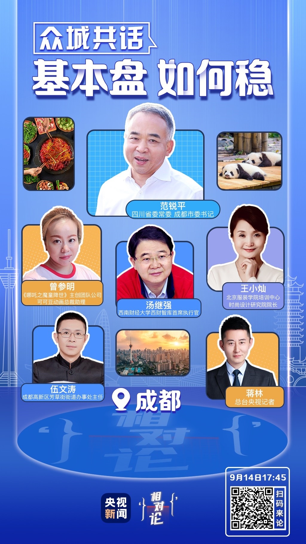 9月14日下午5:45,央视新闻《相对论》“众城共话”第七期,与成都市委书记范锐平共话基本盘,感受烟火气下的大格局!