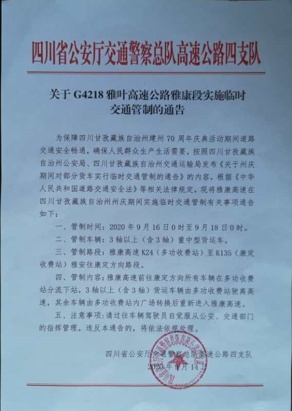 9月14日,省高速交警四分局按照甘孜州《关于州庆期间对部分货车实行临时交通管制的通告》,对G4218雅叶高速公路雅康段实施临时交通管制,具体《通告》如下——