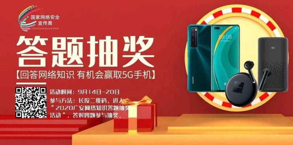 为了提高群众参与积极性,使网络安全意识深入人心,广安市今年还开展了有奖答题竞赛,网民只需点击参与“国家网络安全宣传周线上知识竞赛”,并以答题计分抽奖的方式,评出一、二、三等奖,就有机会赢得华为5G手机。
