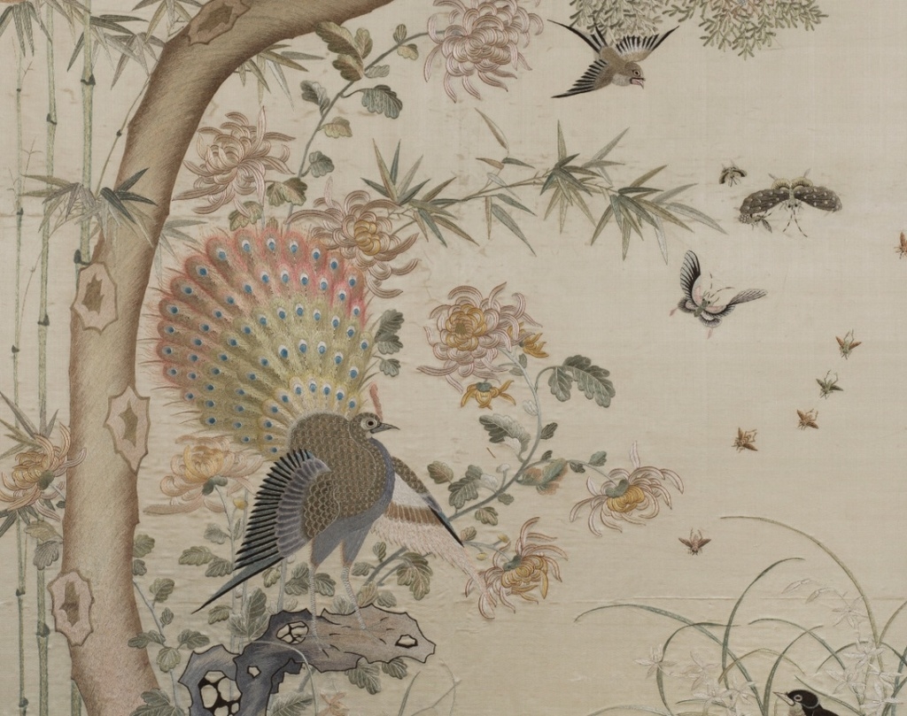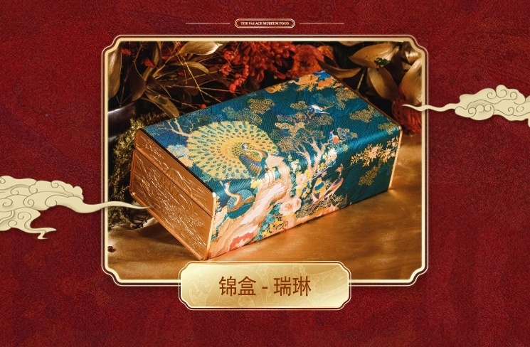 锦盒上的图案取自 「清·粤绣孔雀开屏图」上的元素,瑞鸟开屏,有吉祥的寓意。