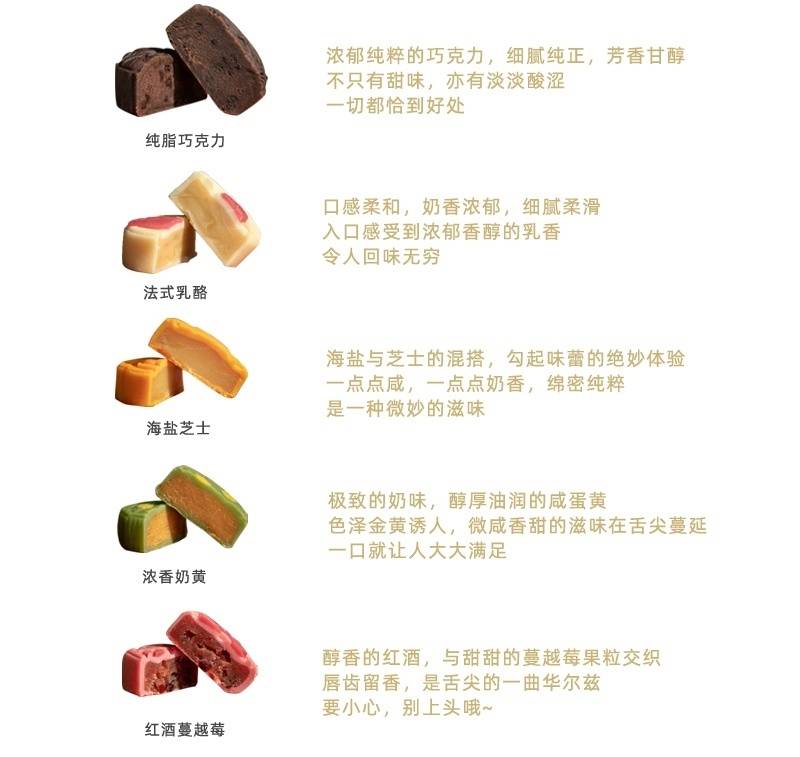 在口味的选择上,尝试了更符合现代人饮食习惯的创新口味,经过数十轮回品尝及研发配比,并且尽量降低糖份和脂肪的比列,最终确定了这五款口味: