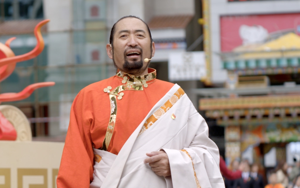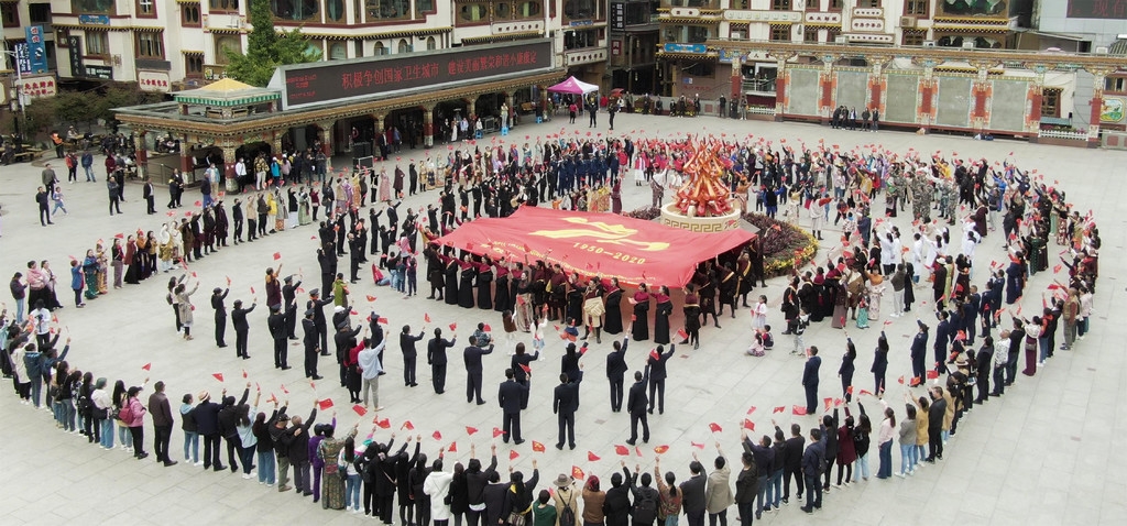 就在众人忘情高歌之时,来自州歌舞团的50多名演员将一面巨大的印有建州70周年标志的红旗,在广场正中铺展开来。以这面旗帜为中心,先后到来的人们组成了三个同心圆,用歌声礼赞甘孜建州70年。