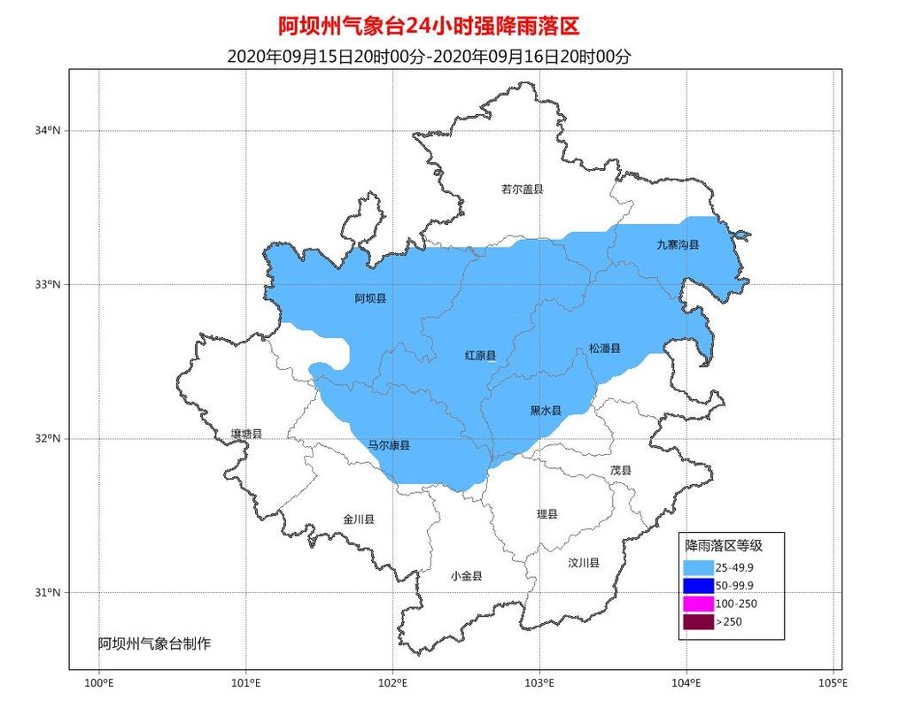 9月15日下午,阿坝州气象台发布暴雨蓝色预警:预计,15日20时到16日20时,受高原切变线影响,阿坝州多云转阴天有中雨到大雨,阿坝县、红原县、九寨沟县、松潘县、黑水县、马尔康市部分地方有暴雨(25~40毫米),过程来临时将伴有雷电、短时强降水和阵性大风等强对流天气。
