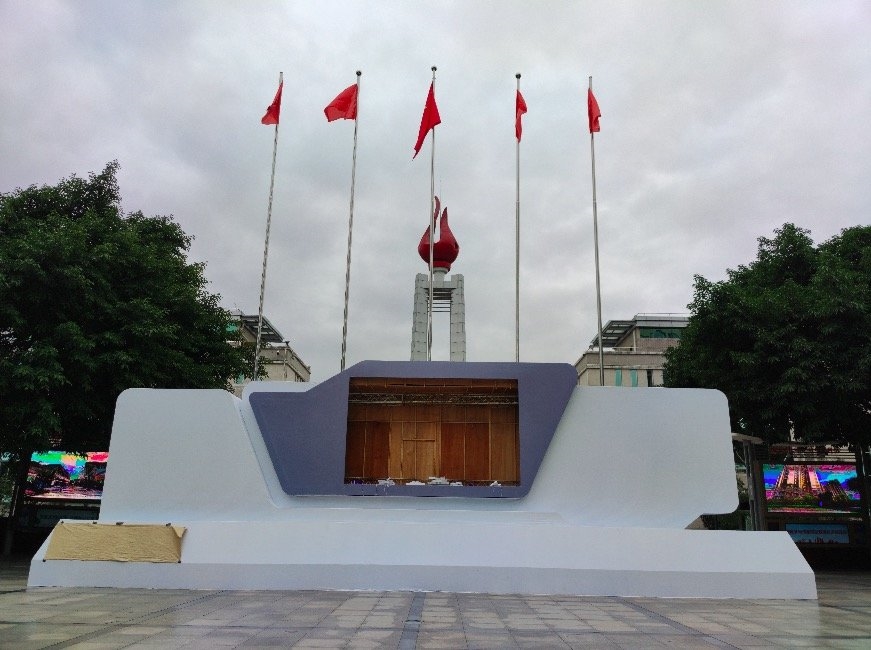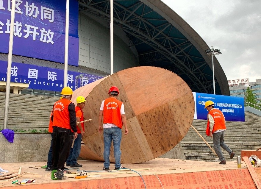 位于绵阳市火炬广场的科博会展示牌正准备喷涂颜色。郭若雪 摄