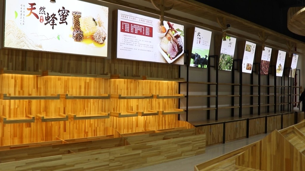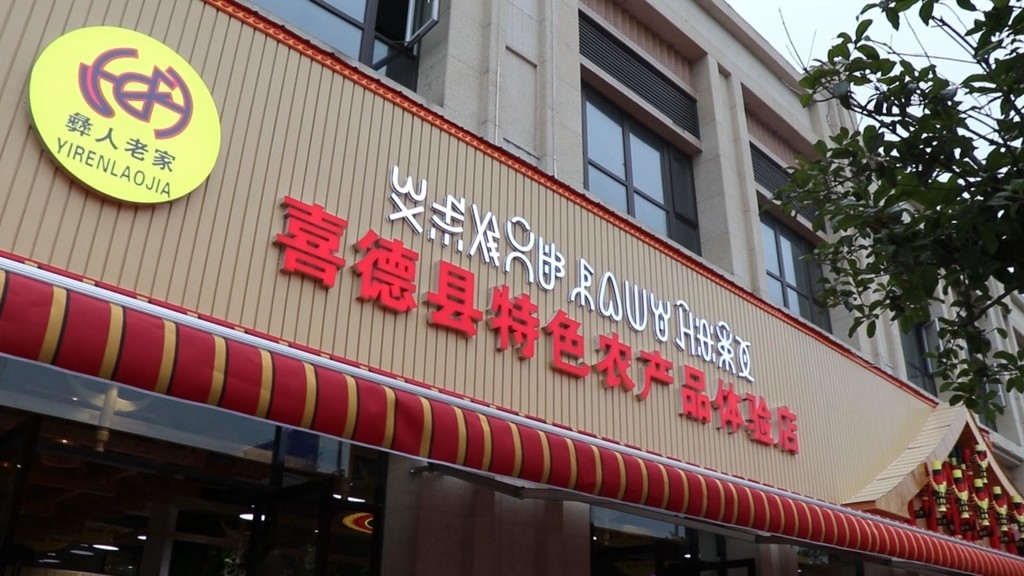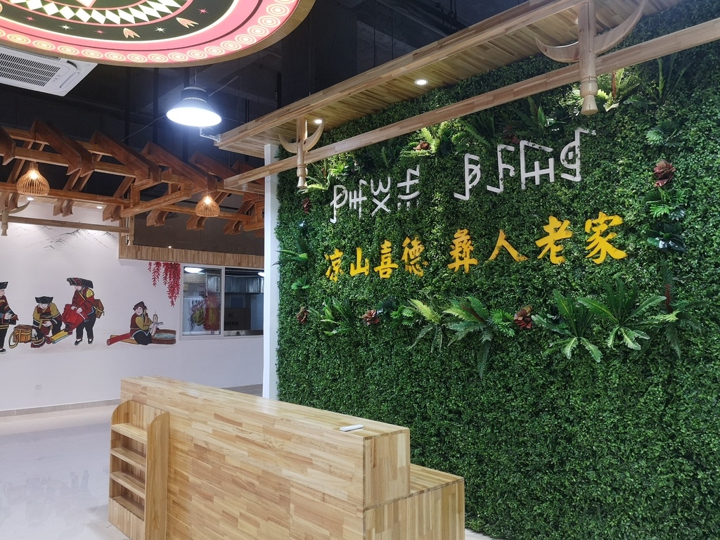 在什邡城区蒙顶山路的喜德特色农产品体验店内,装修工作已接近尾声,工作人员正在进行最后的清扫保洁。店内融入彝族火把节、彝族民歌以及虎、牛角图案等文化元素,极具民族韵味。