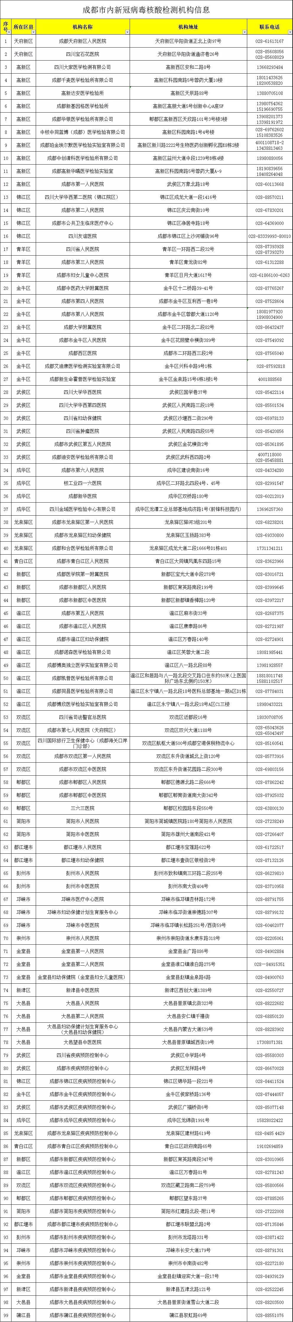 新增的9家新冠病毒核酸检测机构包括:包括成都市温江区妇幼保健院、都江堰市妇幼保健院、邛崃市妇幼保健计划生育服务中心、邛崃市中医医院、金堂县第二人民医院、大邑县第二人民医院、核工业四一六医院、三六三医院、成都和合医学检验所。